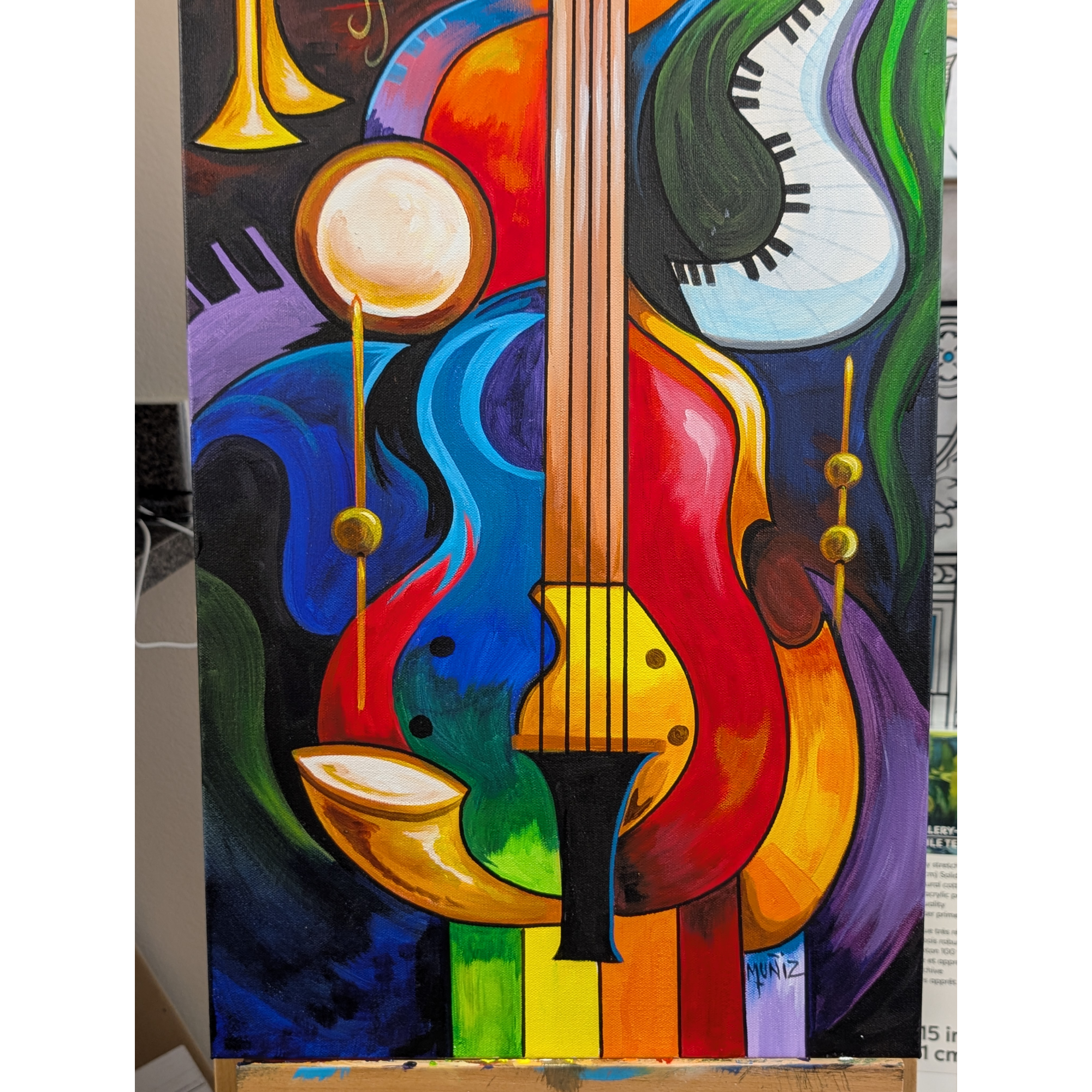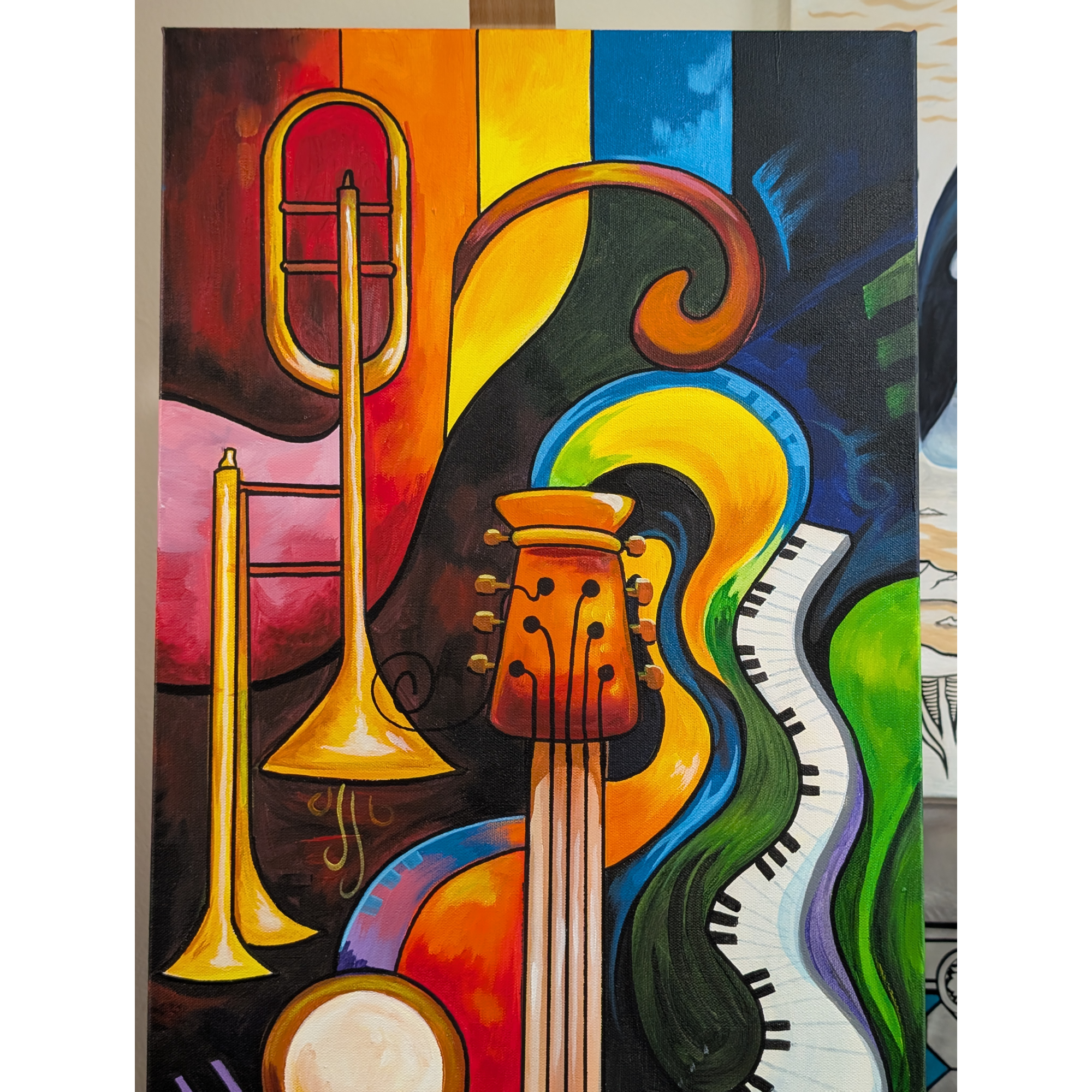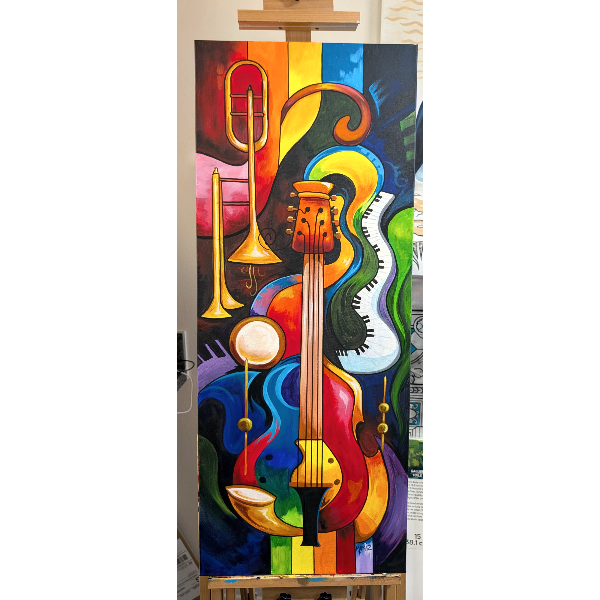 Abstract Music Art – Rhythms of the Canvas is a bold celebration of sound, movement, and color. This tall 16″x40″ original painting transforms classic jazz instruments into sweeping curves, vibrant shapes, and flowing energy. Saxophones, drums, and piano keys merge into a lively abstract composition that feels like music you can see. Perfect for collectors who love expressive artwork with personality and rhythm.