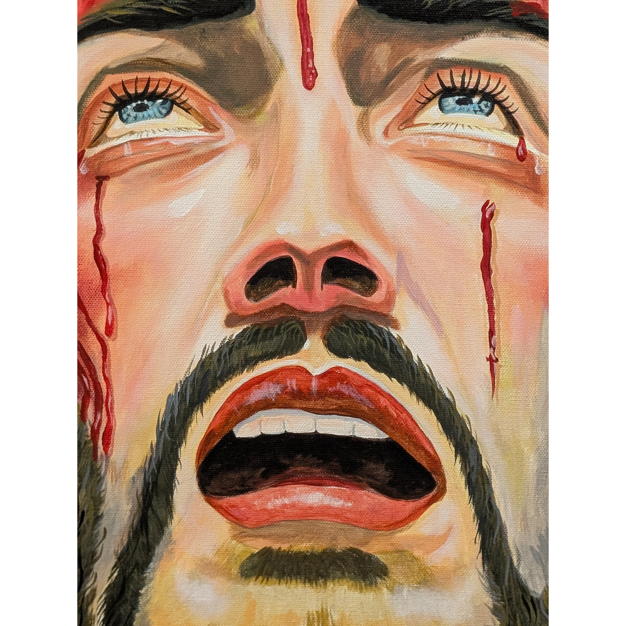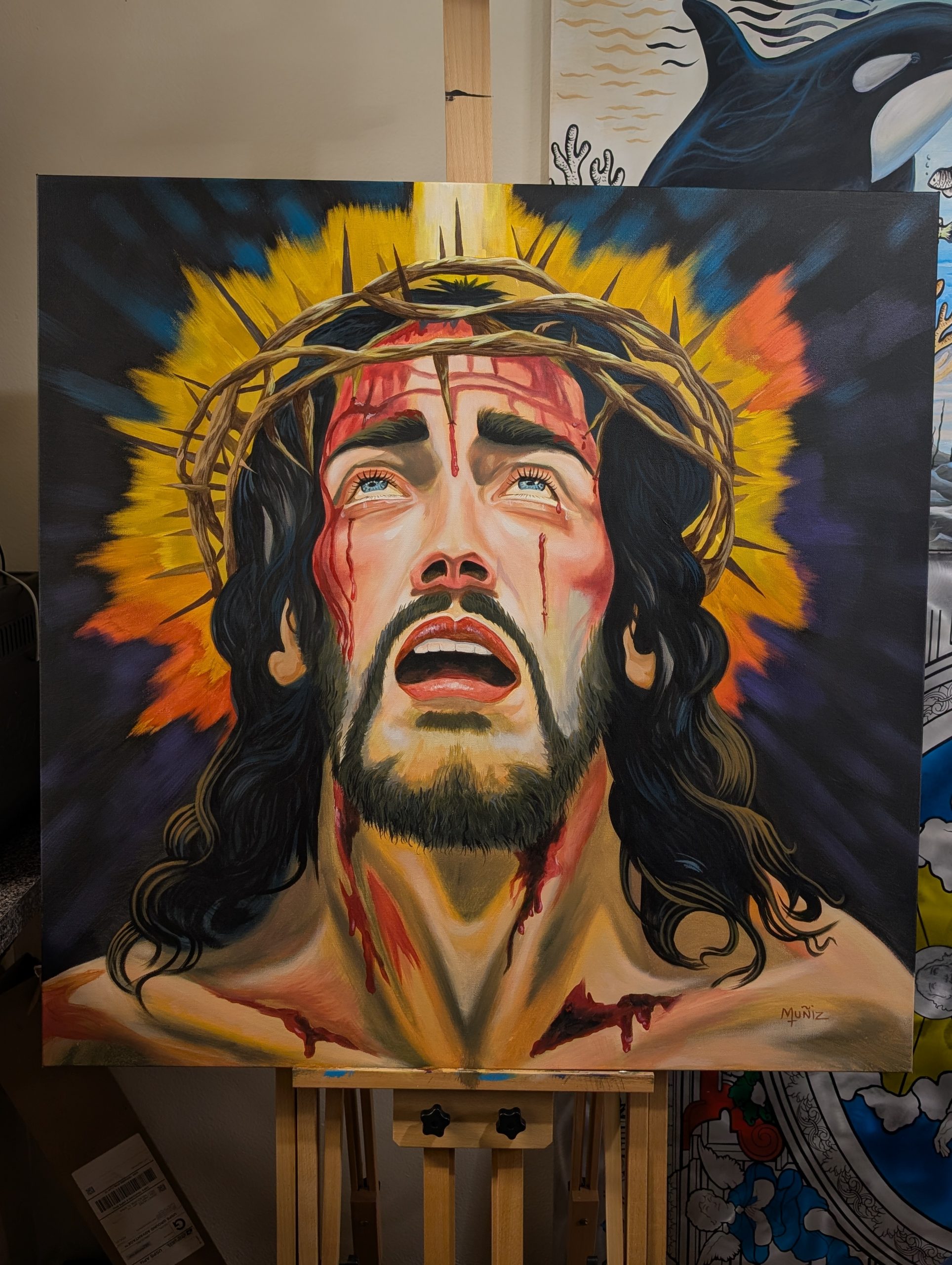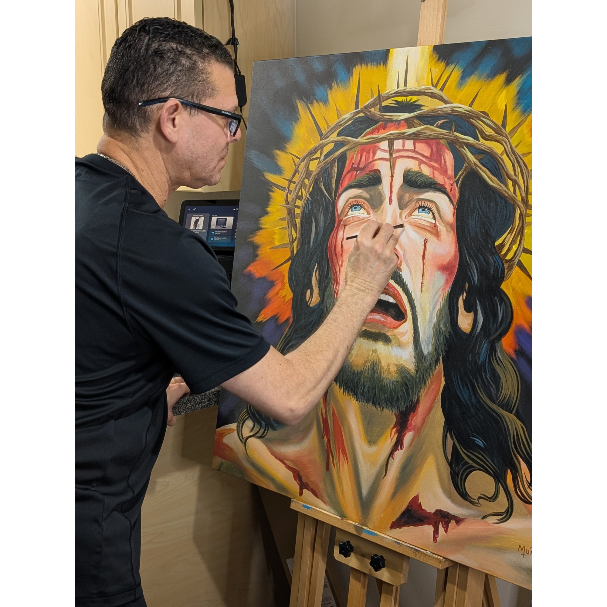 Painted with layered brushwork, rich shadows, and luminous highlights, this piece blends realism with expressive color to create a modern, impactful interpretation of a timeless subject. Signed by the artist, this original painting makes a meaningful centerpiece for prayer rooms, churches, studios, or any home seeking uplifting spiritual artwork.