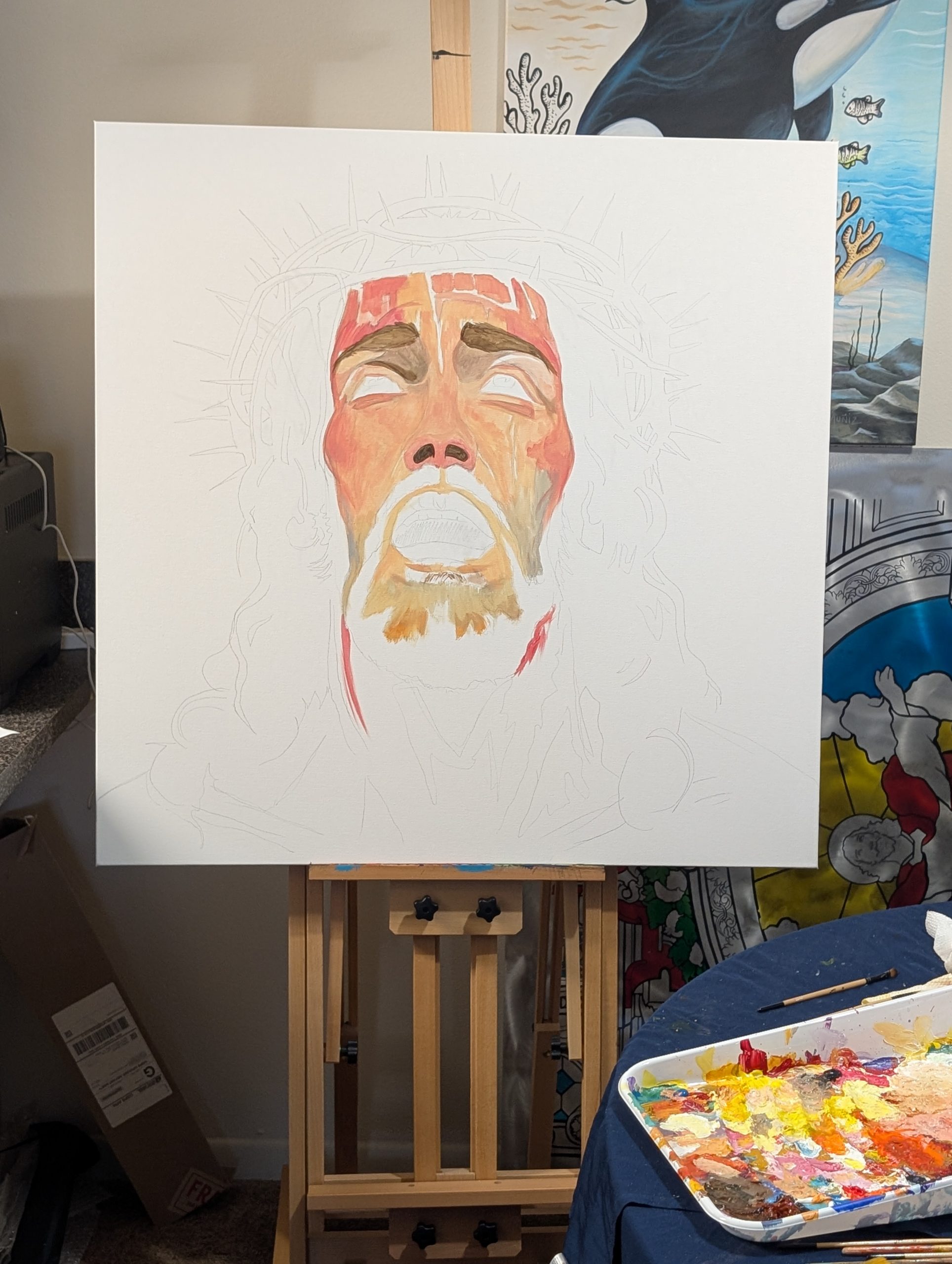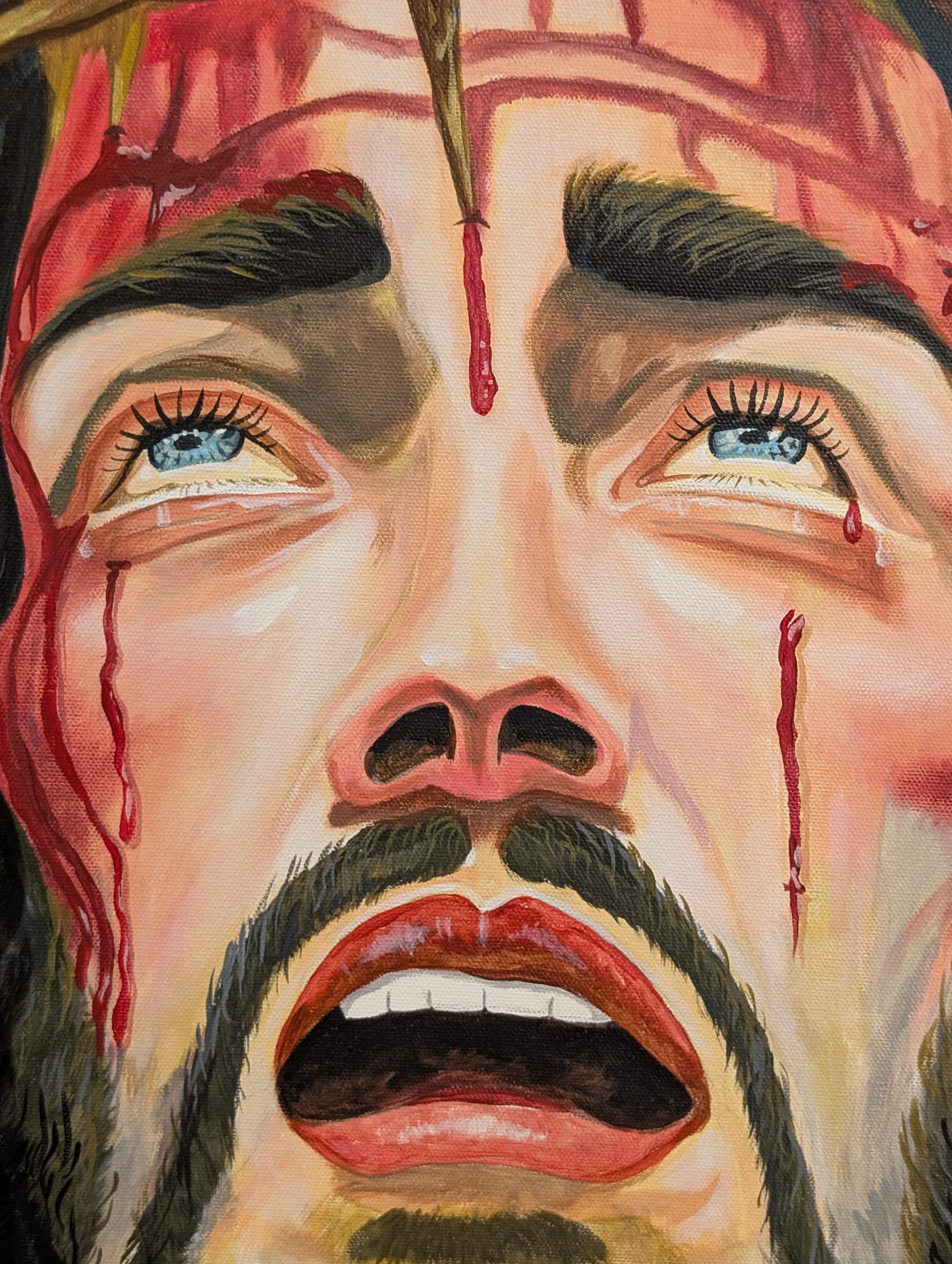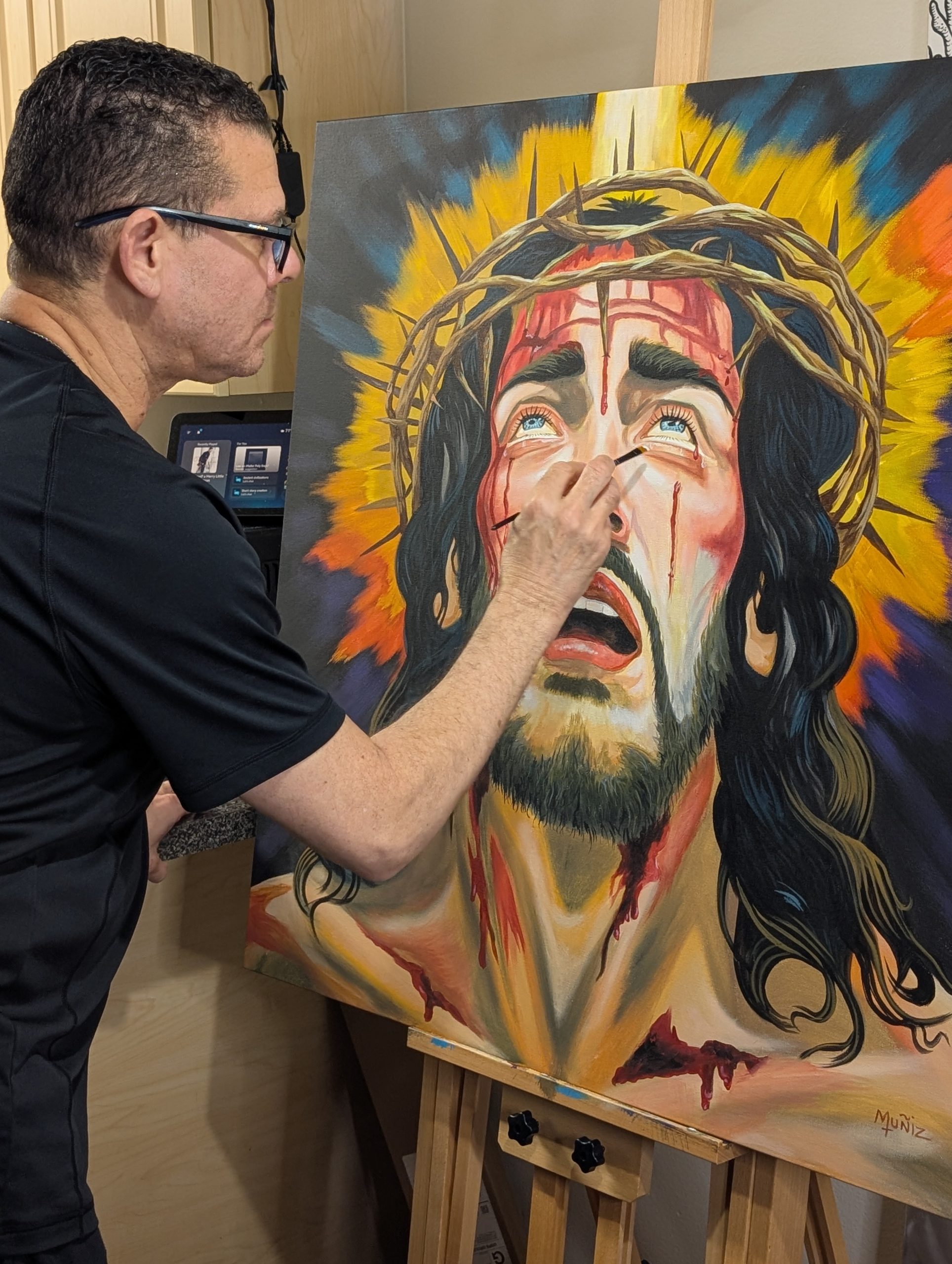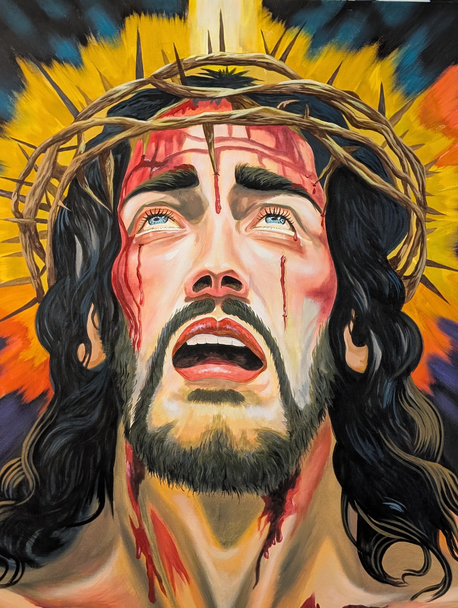 Painted with layered brushwork, rich shadows, and luminous highlights, this piece blends realism with expressive color to create a modern, impactful interpretation of a timeless subject. Signed by the artist, this original painting makes a meaningful centerpiece for prayer rooms, churches, studios, or any home seeking uplifting spiritual artwork.