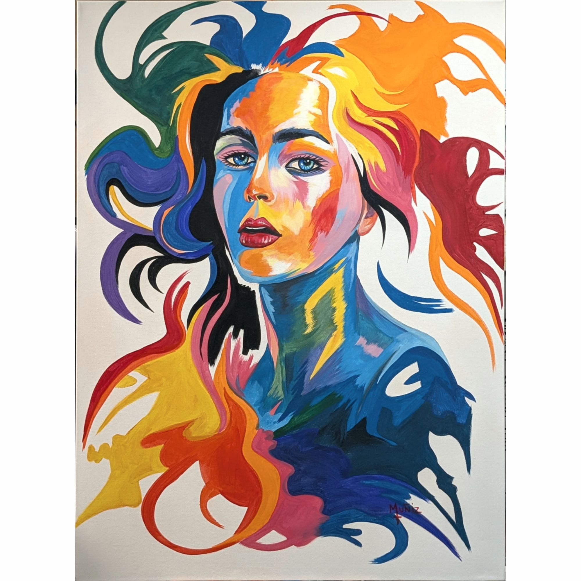Colorful Abstract Portrait Painting. “Chromatic Yearning” is a powerful 30″x40″ abstract portrait painting that blends emotion, color, and contemporary expression. This vibrant acrylic artwork features sweeping curves, rich hues, and a dramatic burst of color surrounding a striking female figure.