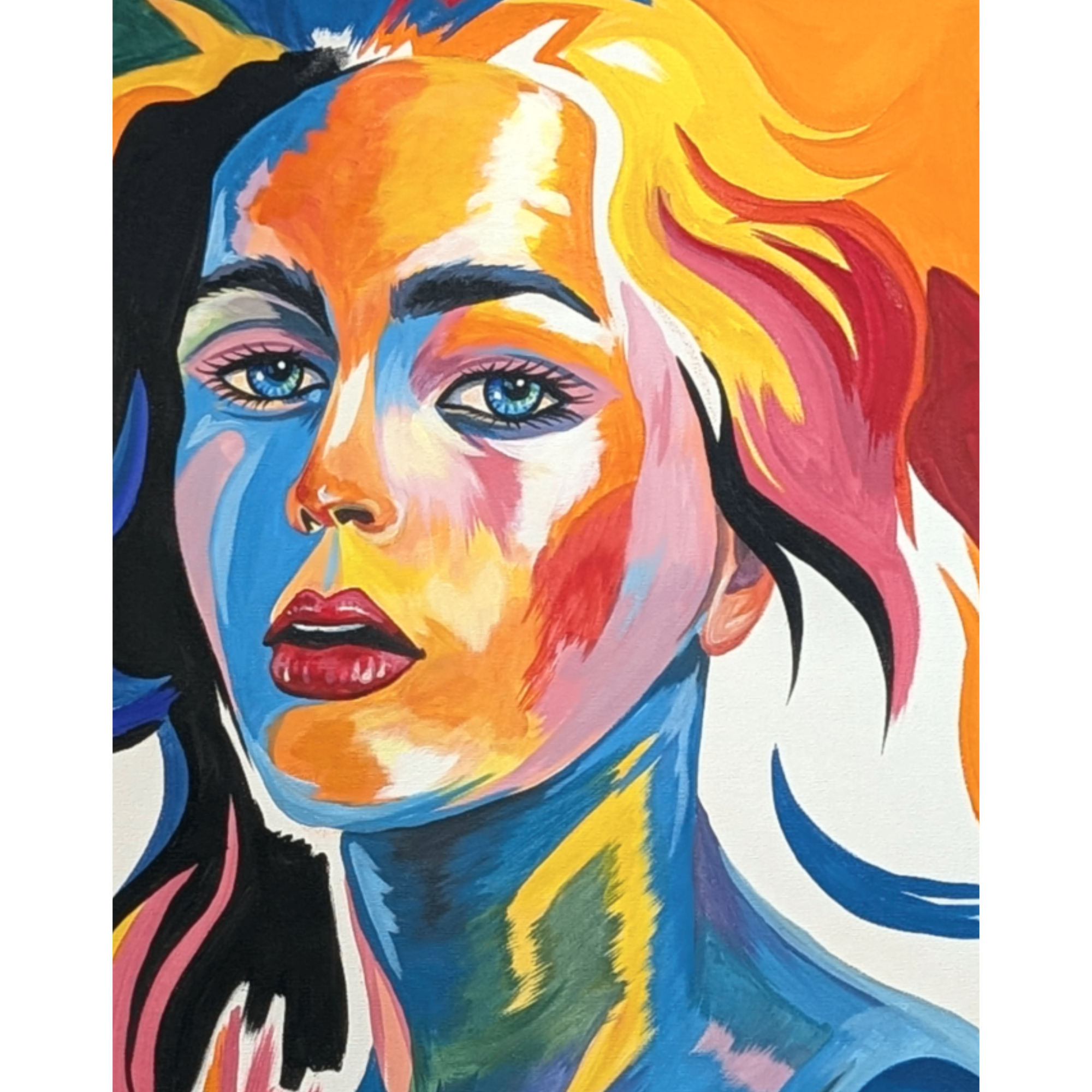 The face is built with bold color-blocked strokes — blues, yellows, reds, greens, purples — each tone representing feeling, movement, and energy. The flowing shapes around her create motion and depth, making the artwork feel alive and full of personality.