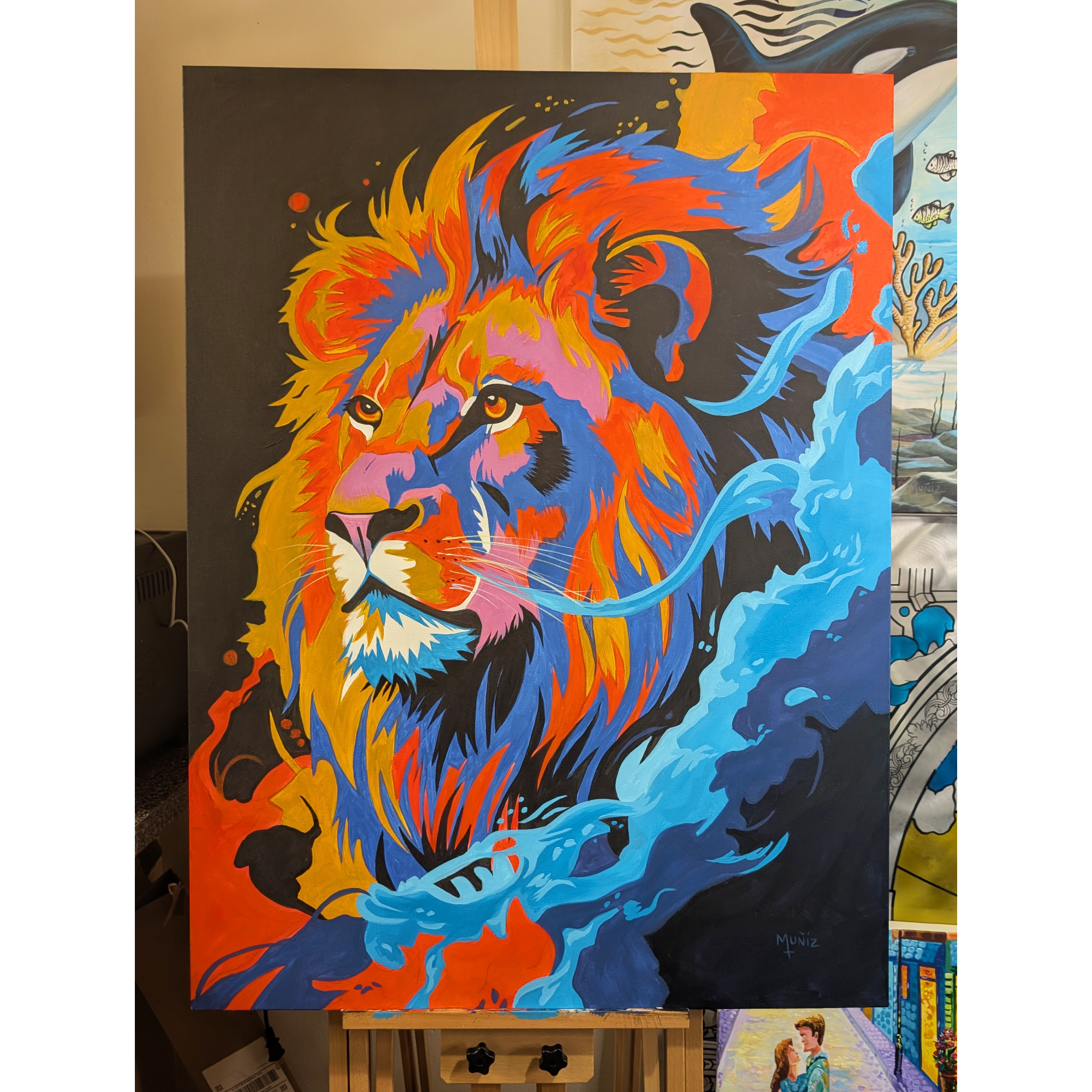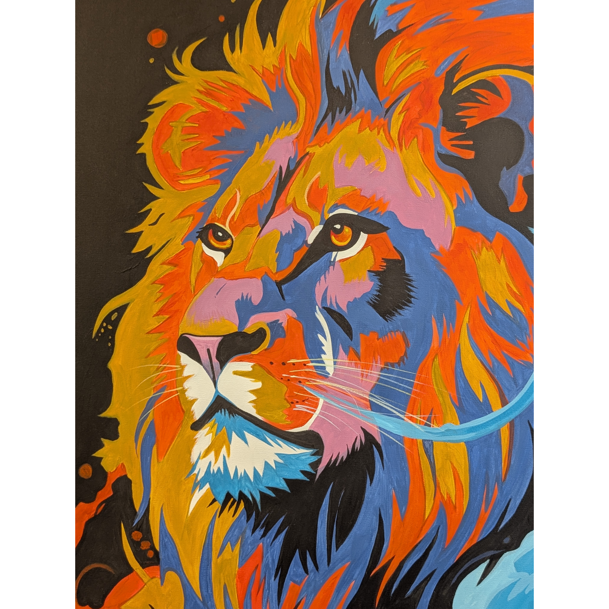 “Dominus” is a powerful 30″x40″ abstract lion painting bursting with color, energy, and bold acrylic expression. This striking piece blends fierce wildlife imagery with modern abstract styling, using fiery oranges, electric blues, deep violets, and sharp highlights to create a lion that feels alive with motion and spirit.