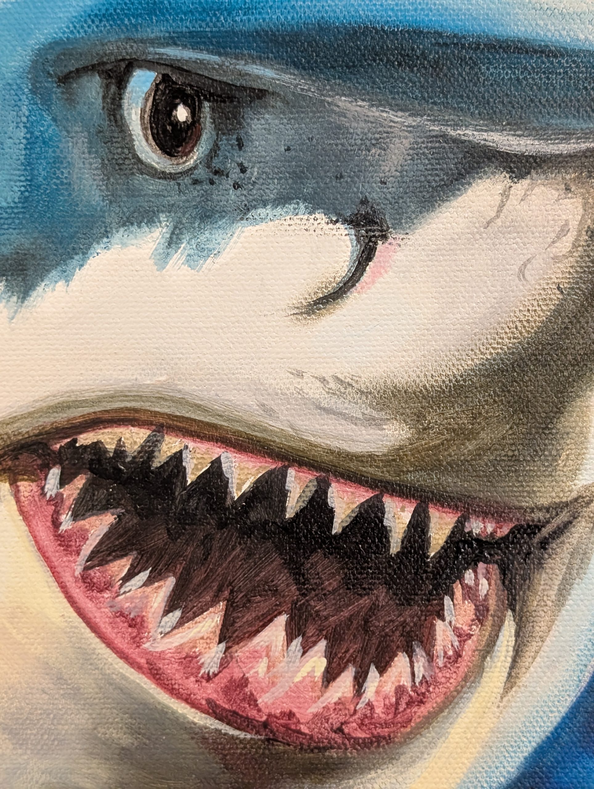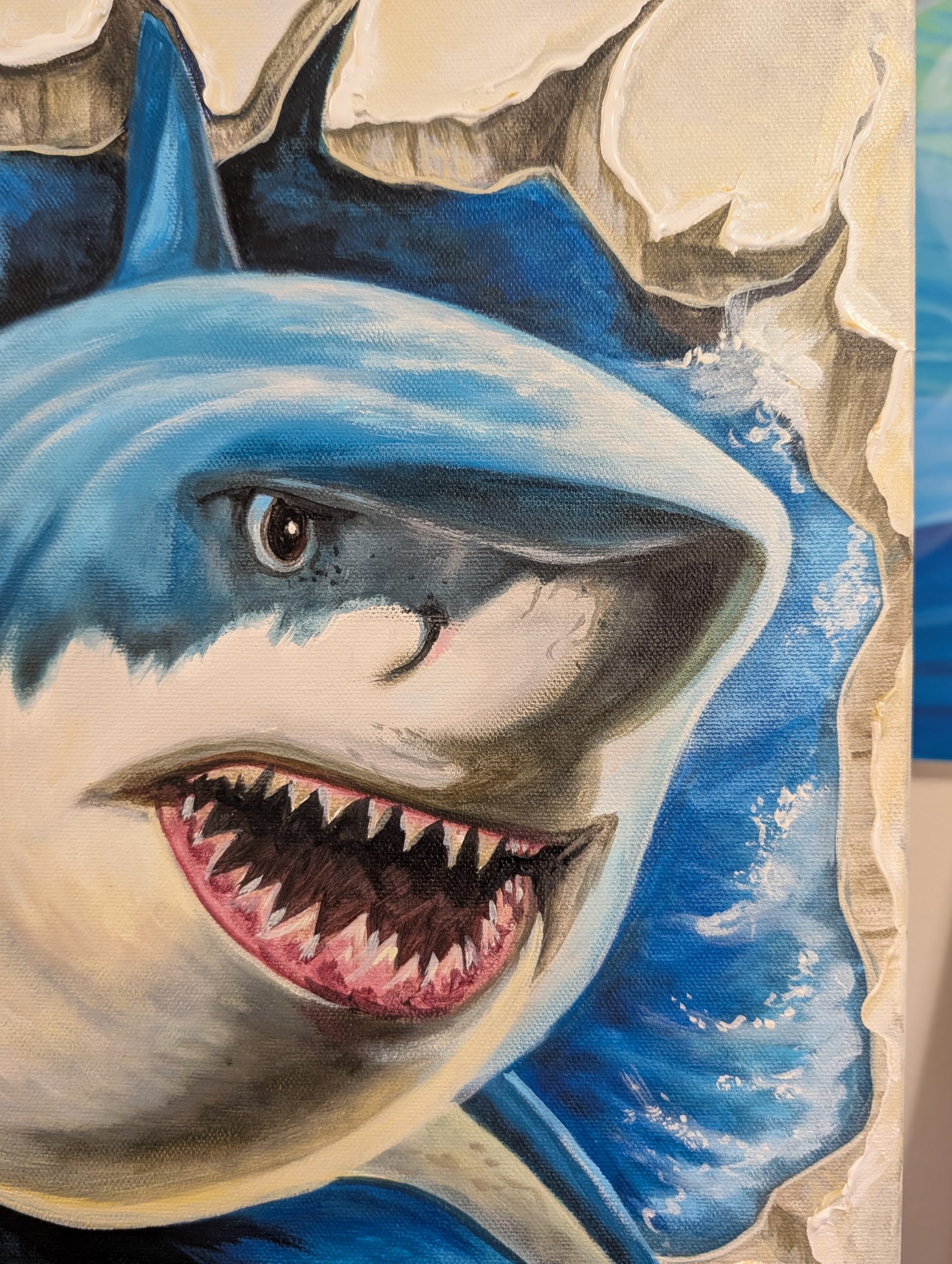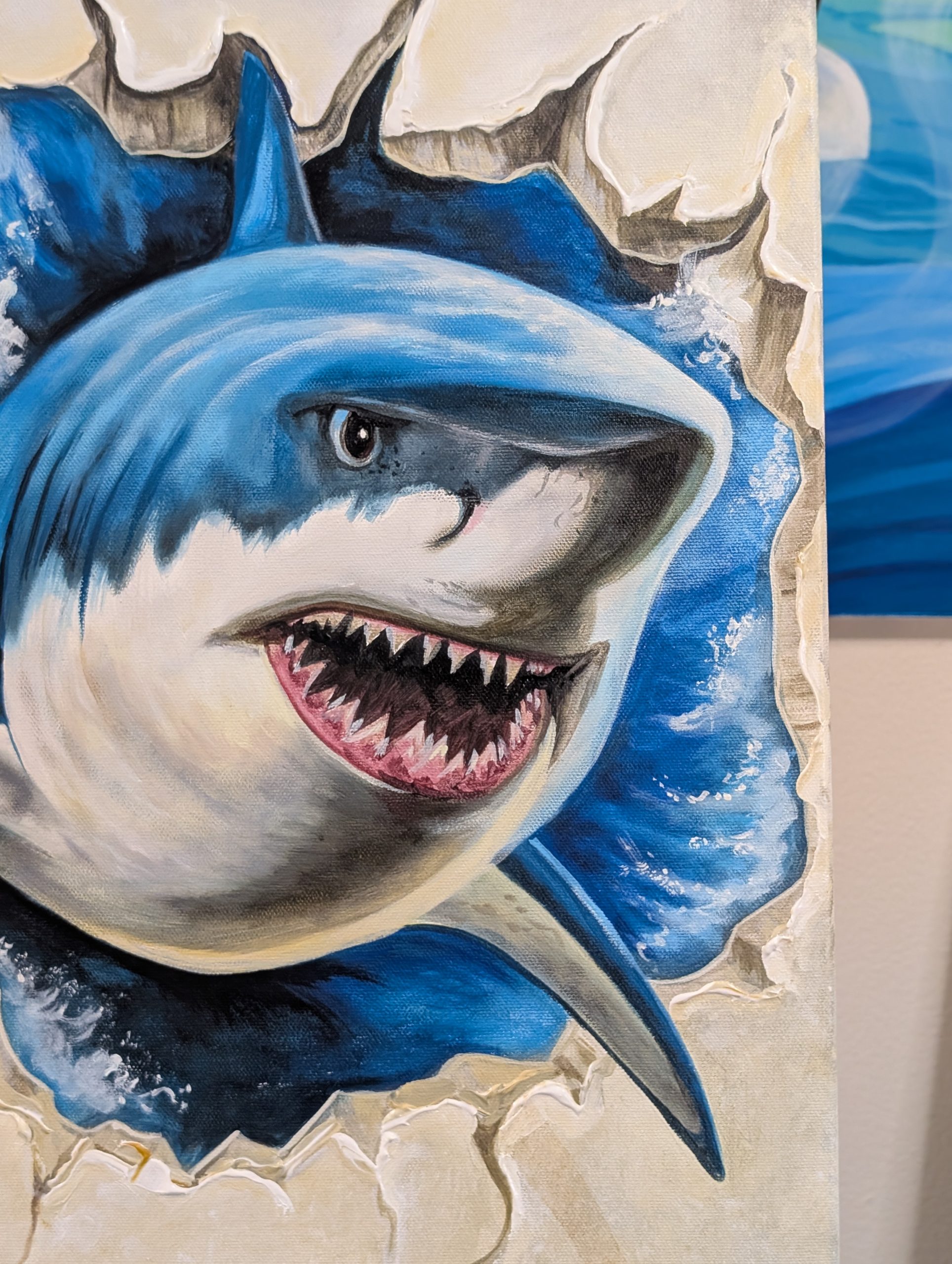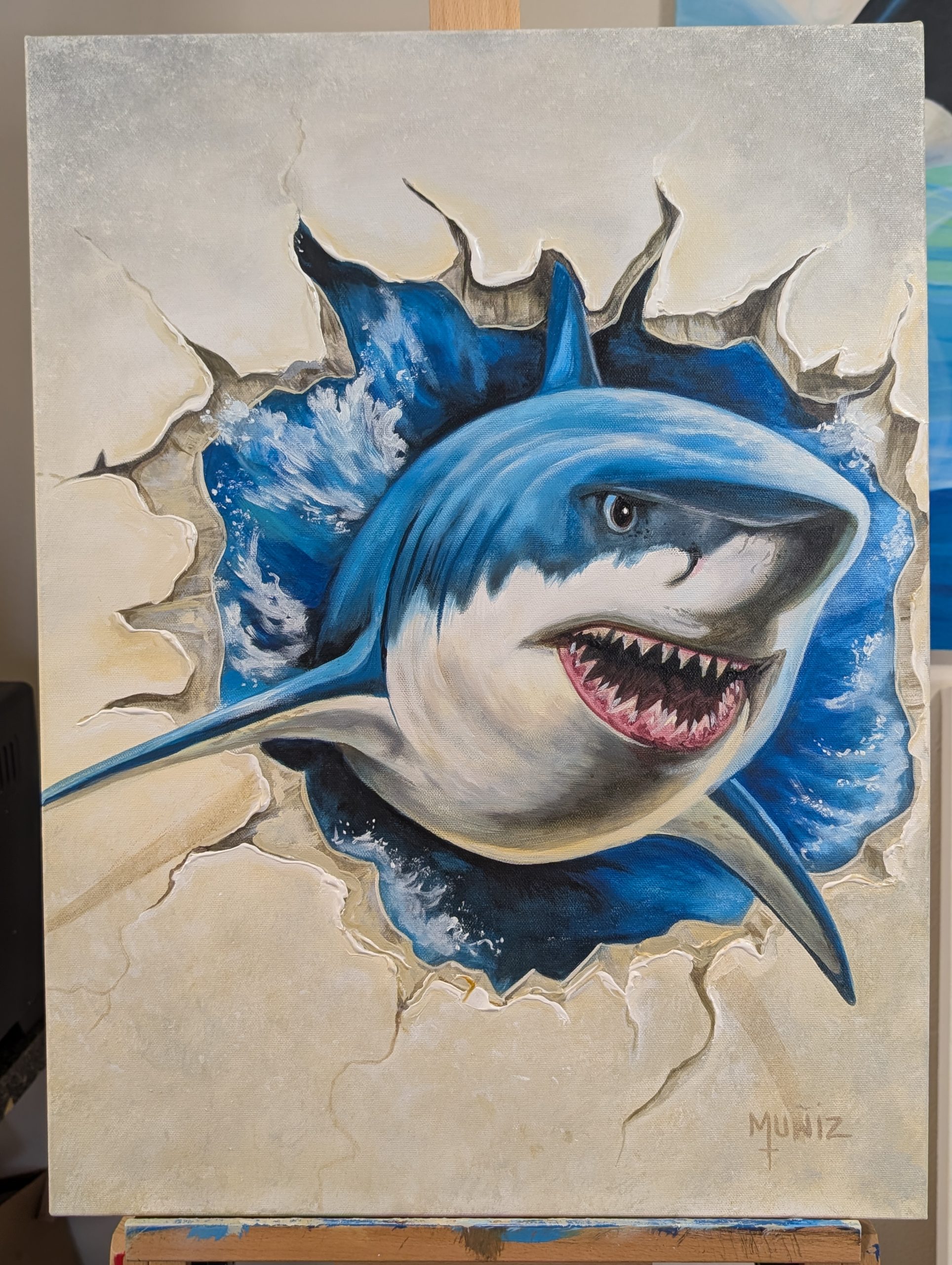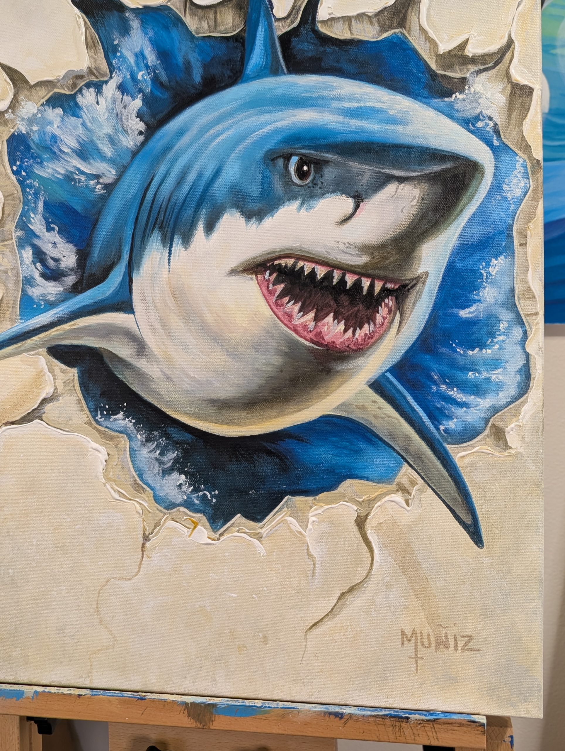 From the Depths, Breaking Through the Deep is an original, hand-painted acrylic artwork created on a professional Level 3 gallery-wrapped canvas by MunizArt. This bold piece captures the raw power and motion of a shark emerging forward, creating a dramatic illusion of depth as if the canvas itself has been broken open.