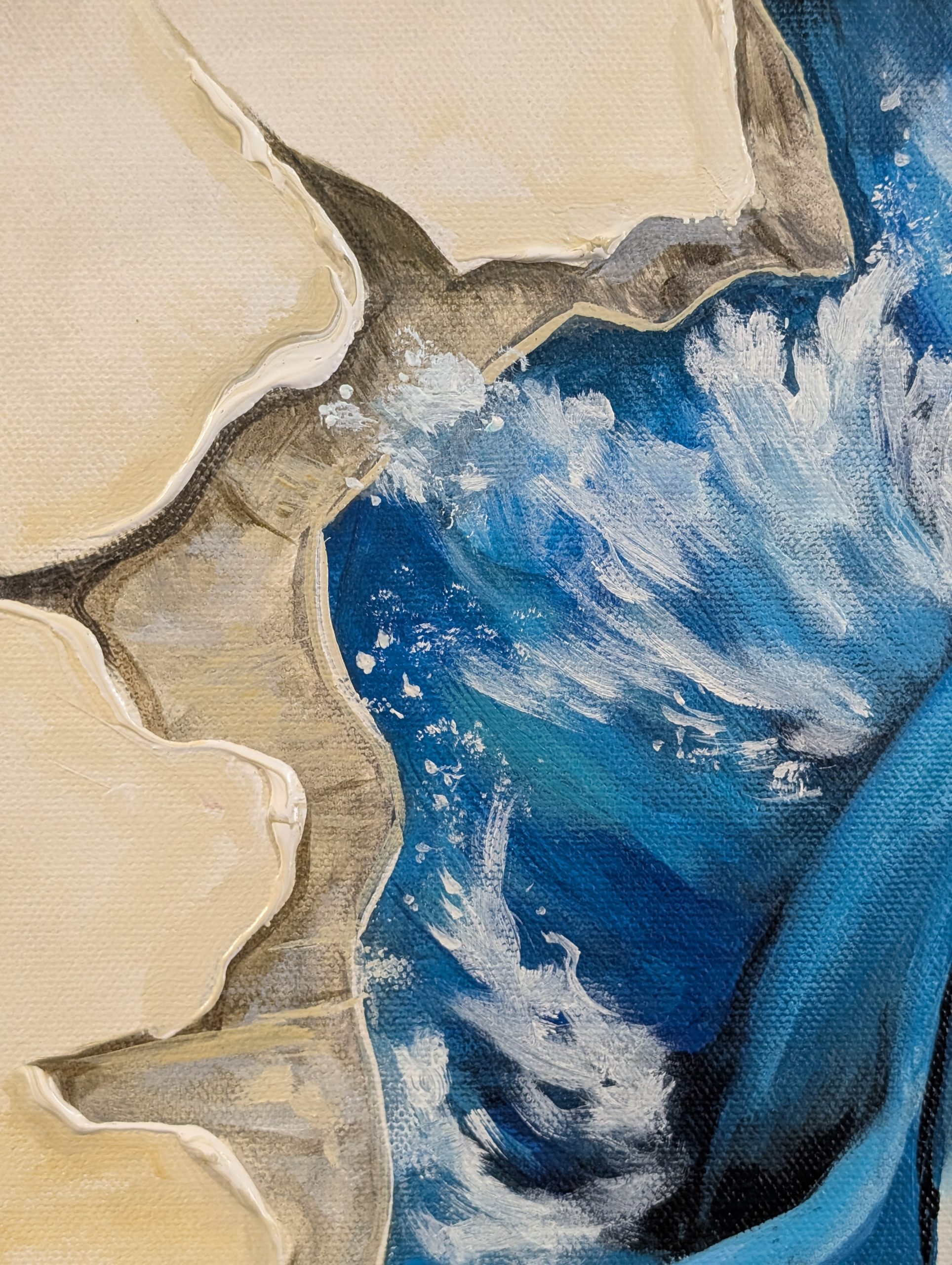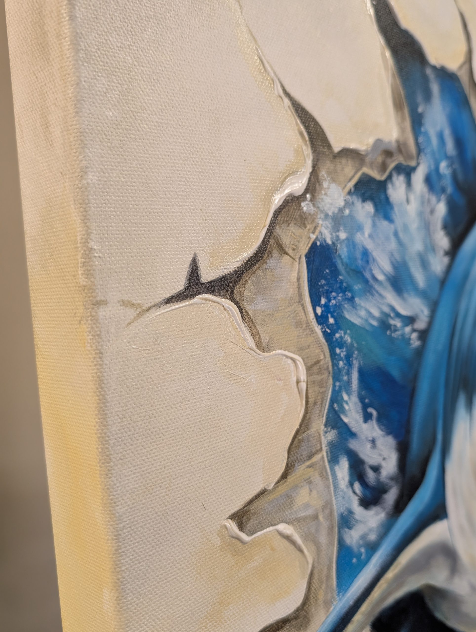 Textured cracks and layered paint enhance the three-dimensional effect, drawing the viewer into the moment of emergence. The contrast between the calm outer surface and the force beneath symbolizes strength, resilience, and untamed ocean energy. Rich blues, whites, and expressive brushwork bring the shark to life, making this artwork a striking focal point in any space.