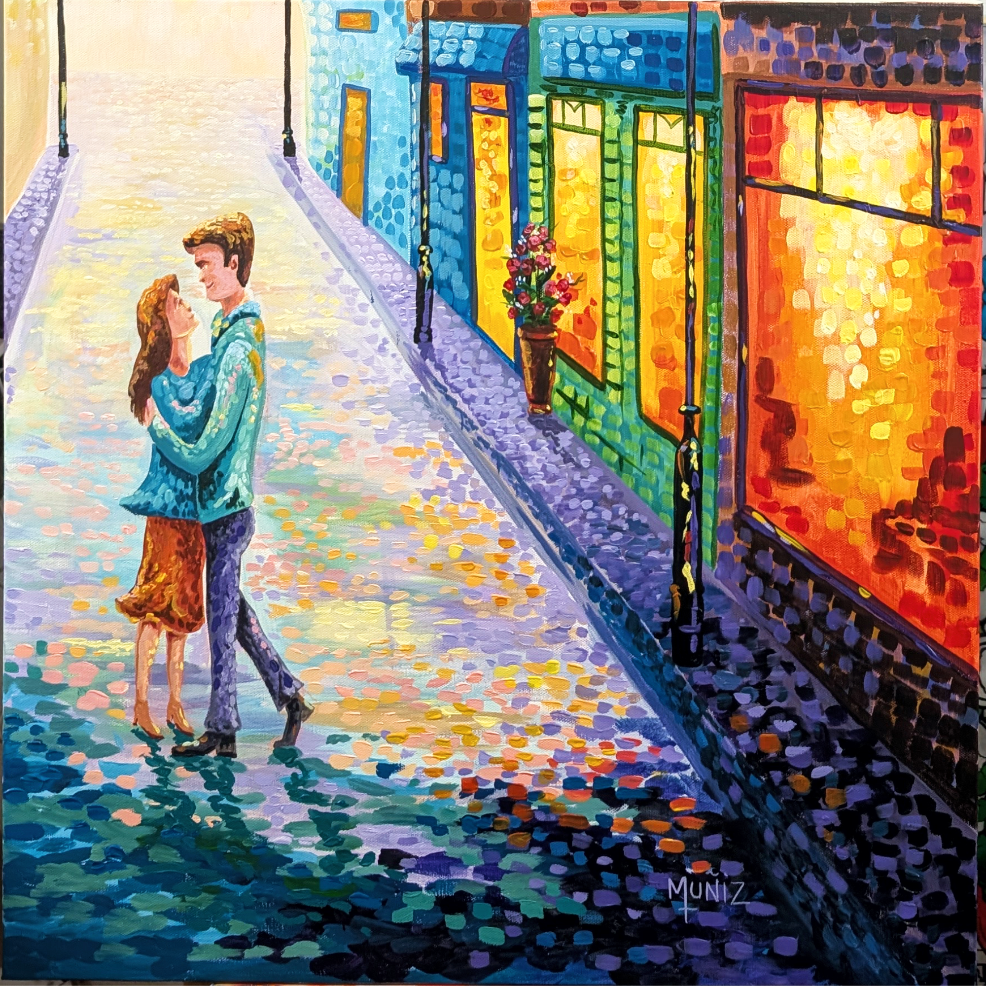 Experience warmth, romance, and color with “City Duo Love,” a vibrant two-panel diptych designed to glow with emotion. Each 24″x24″ canvas forms half of a single scene—a couple embracing in the heart of a colorful city street illuminated by warm shop lights, textured reflections, and expressive impressionist brushwork.