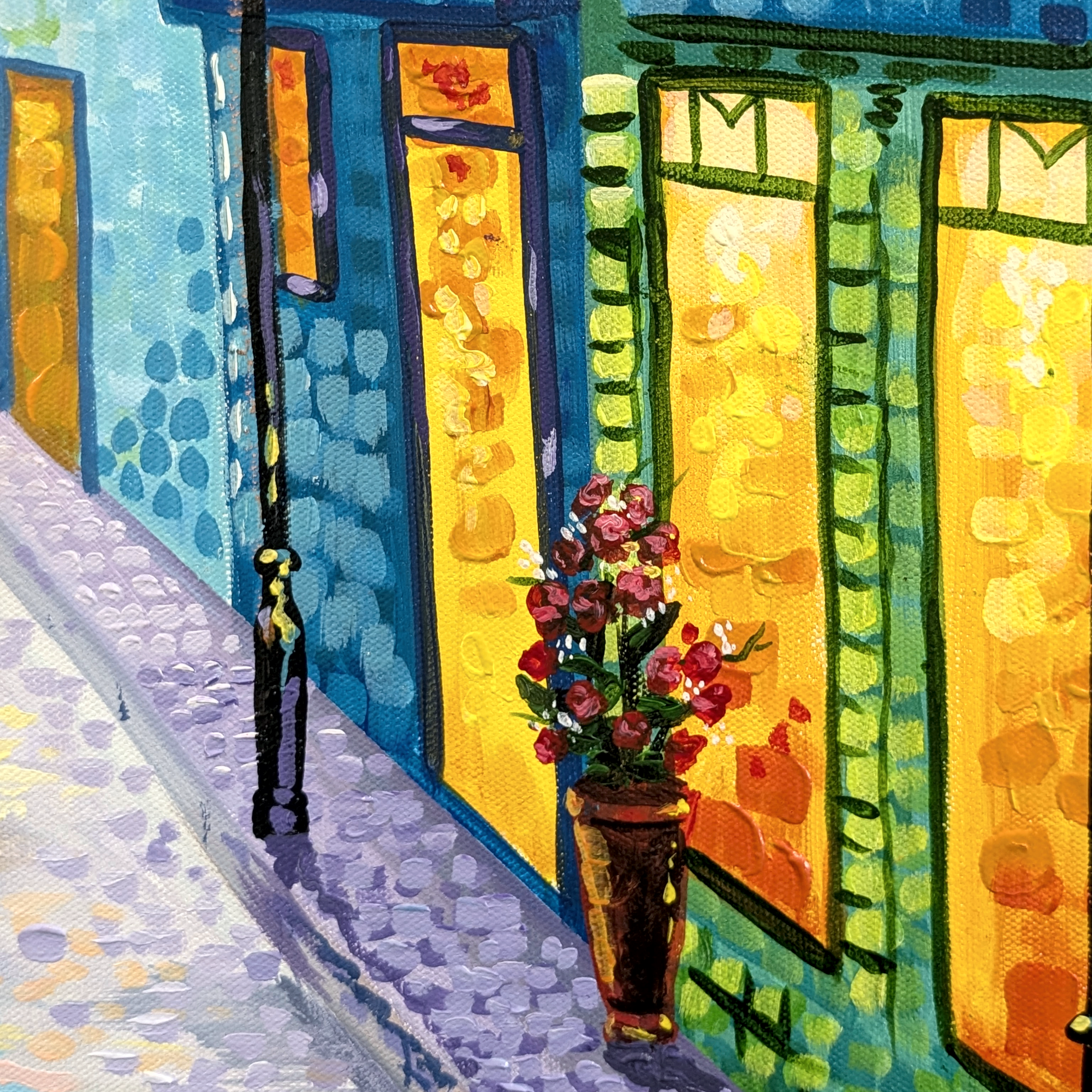 The two canvases come together to create one continuous image full of movement and atmosphere. Painted by hand using premium acrylics, the piece features rich jewel tones, glowing street reflections, and a lively palette that brings the entire scene to life. Whether displayed in a living room, bedroom, or entryway, this diptych creates a striking centerpiece that feels both intimate and cinematic.