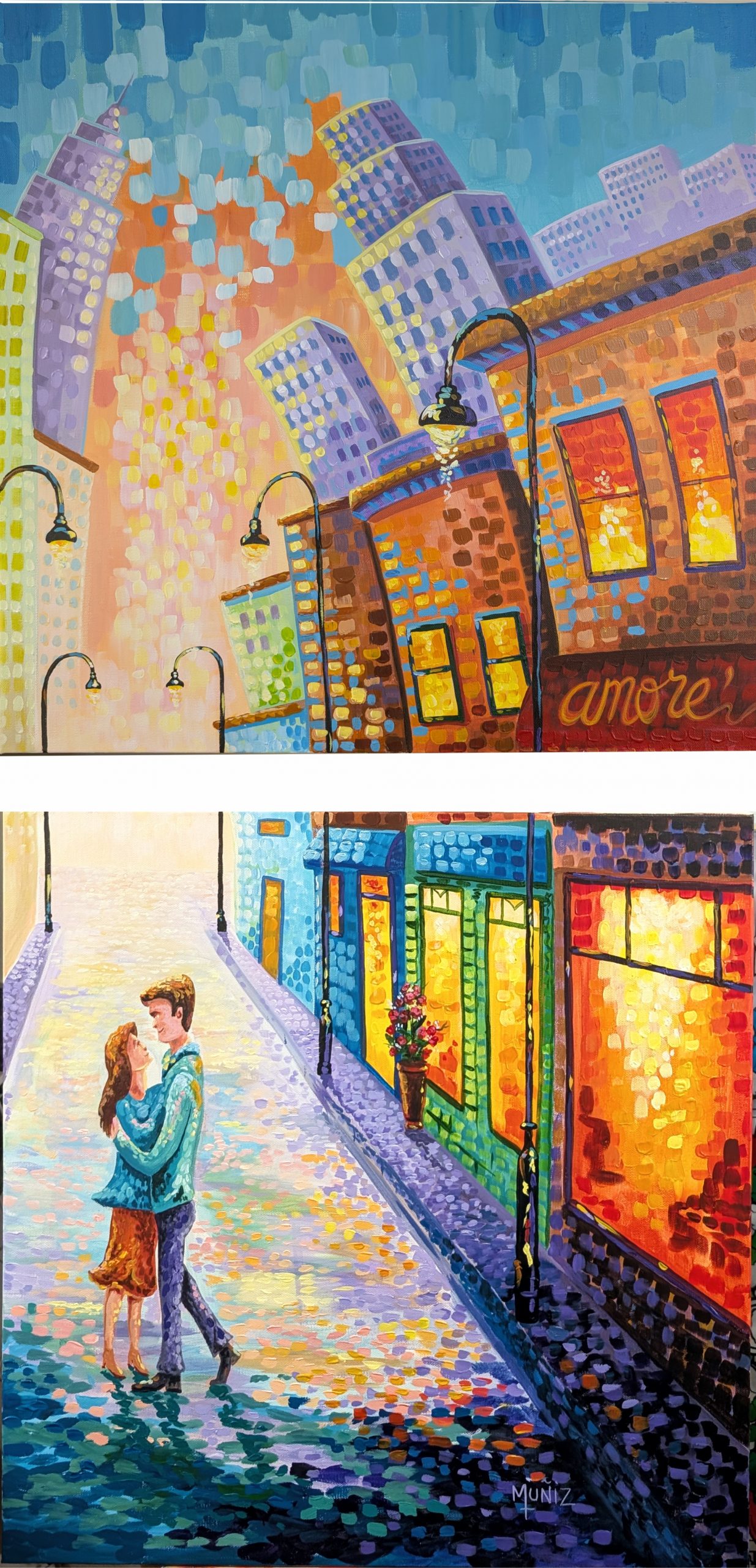 Both canvases are painted on premium, gallery-wrapped frames with reinforced supports, ensuring durability and a strong, professional presentation. The artwork arrives ready to hang and is perfect for collectors who appreciate romantic city scenes, impressionist color, and expressive storytelling through paint.
